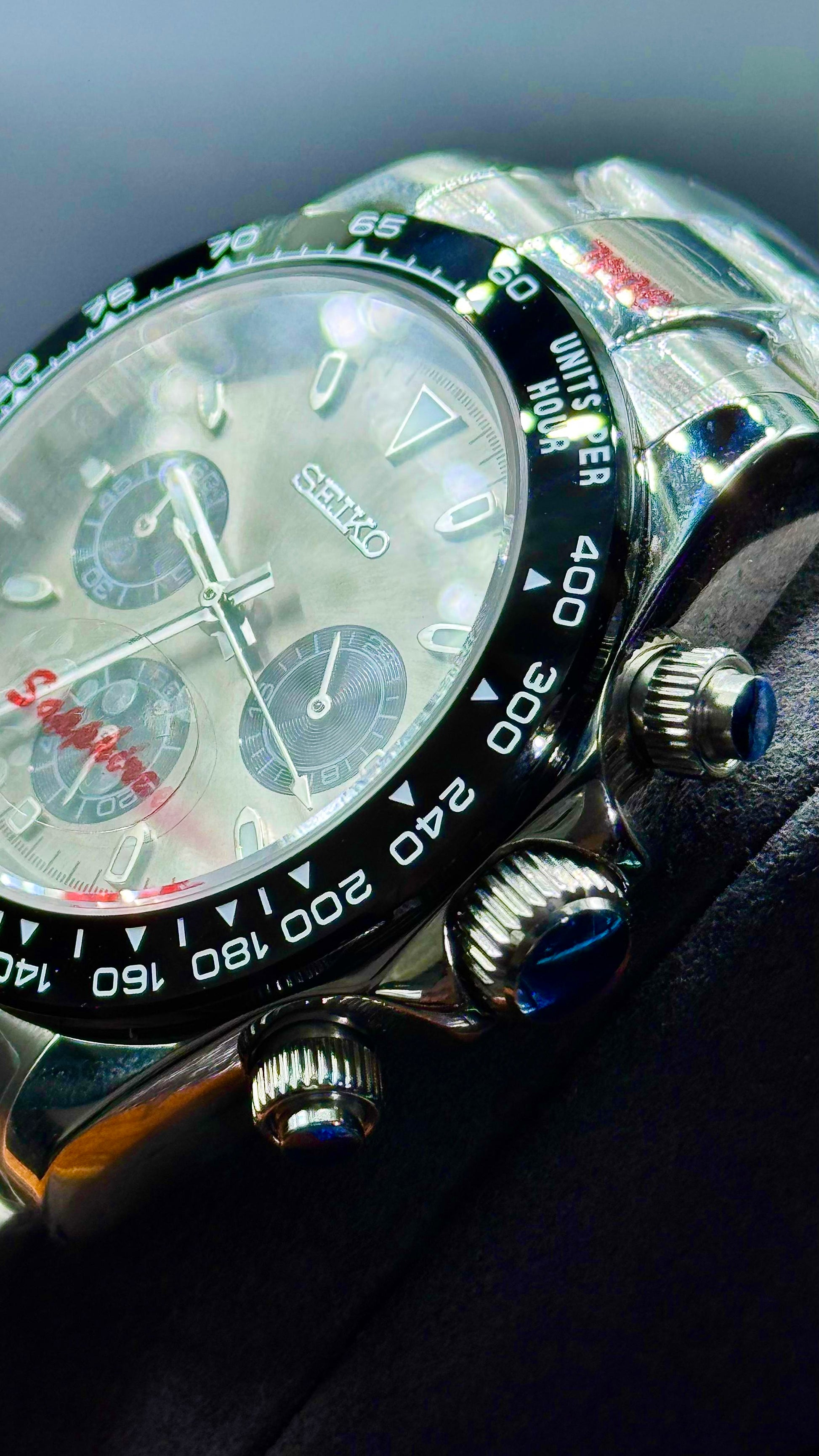 Cristal de zafiro, acero inoxidable solido, resistencia al agua 3ATM, bisel fijo, movimiento cronografo cerrado.