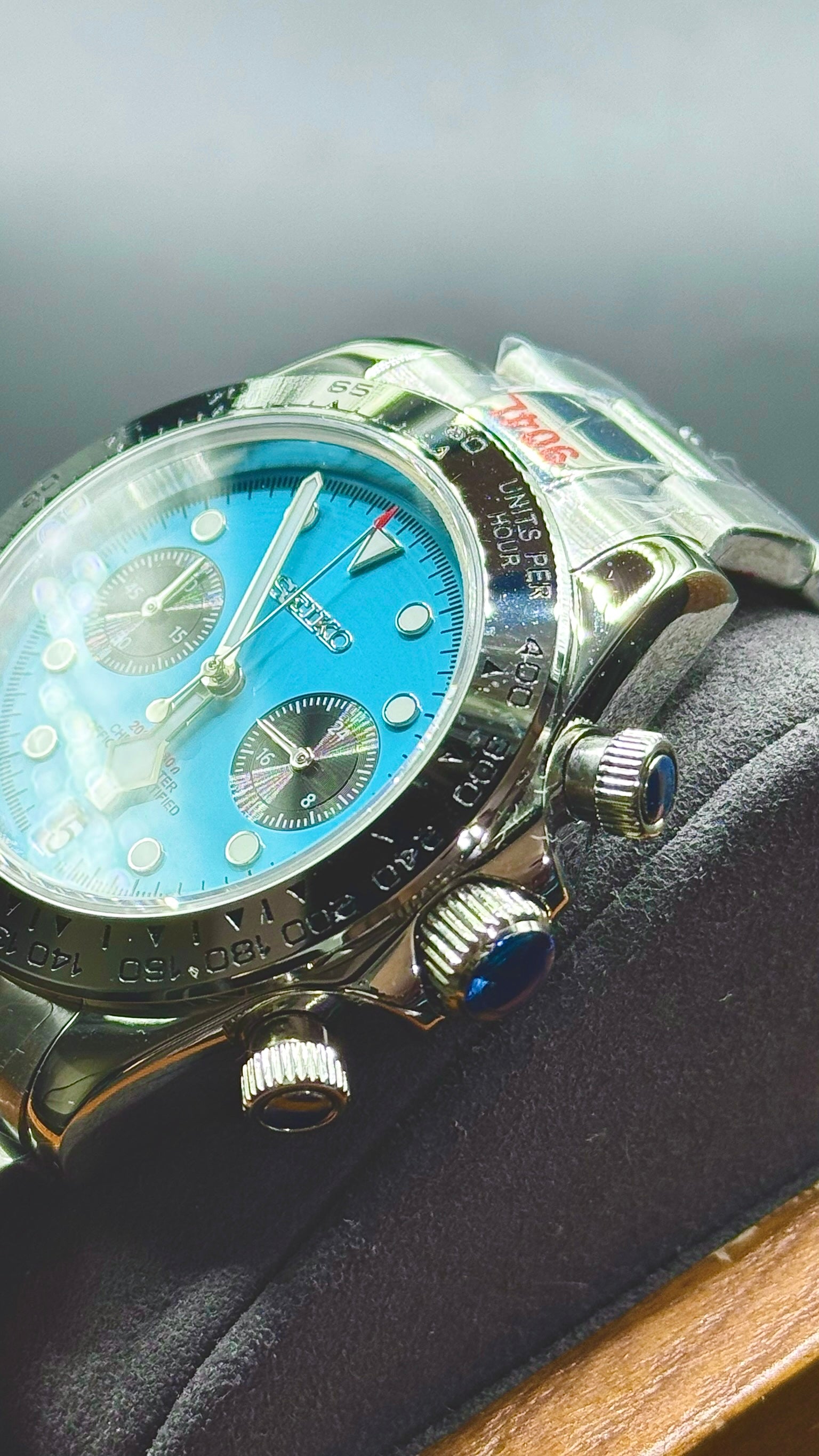 Cristal de zafiro, acero inoxidable solido, resistencia al agua 3ATM, bisel fijo, movimiento cronografo cerrado.