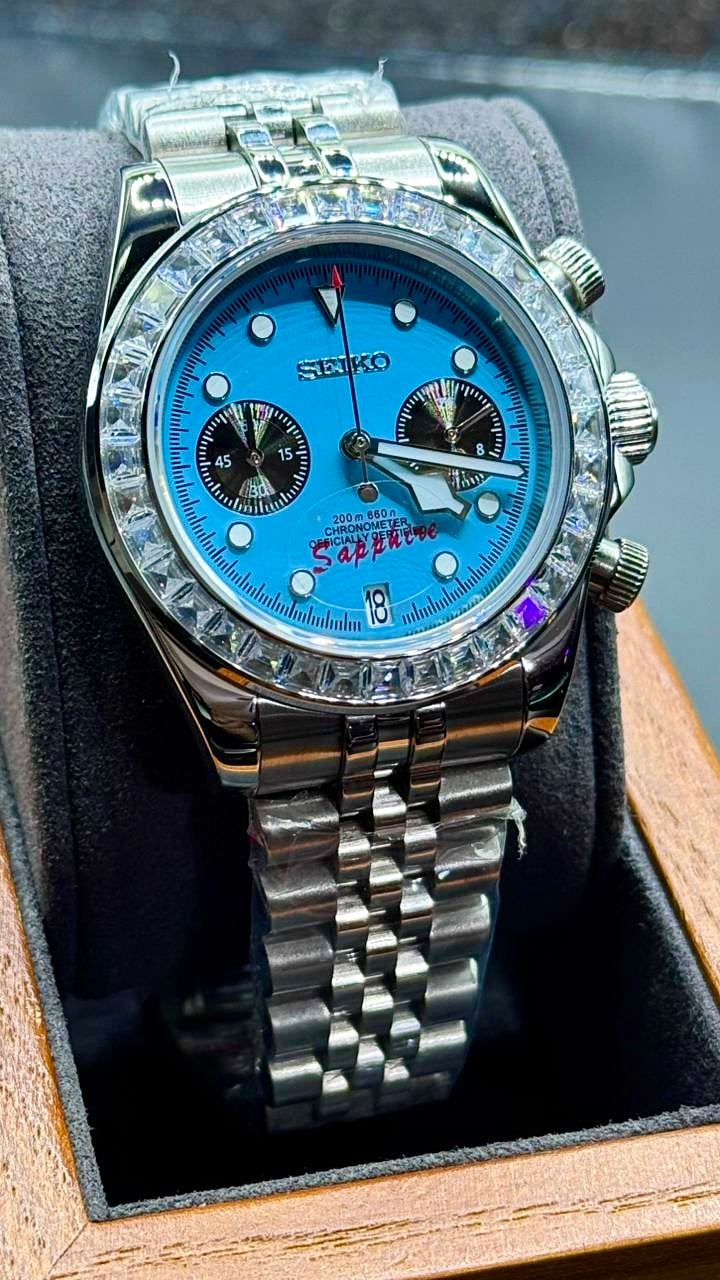 Cristal de zafiro, acero inoxidable solido, resistencia al agua 3ATM, bisel fijo, movimiento cronografo cerrado.