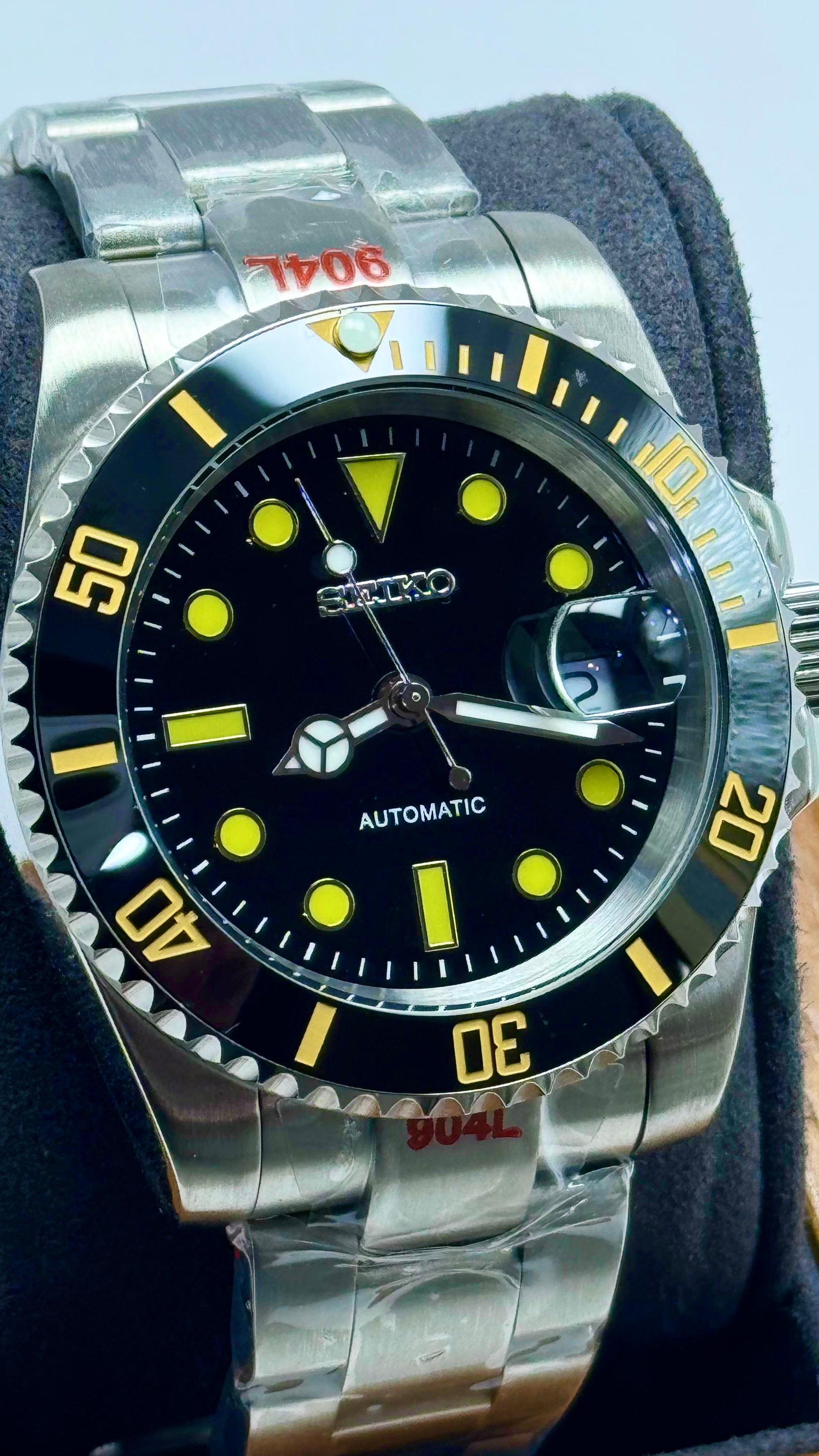 Cristal de zafiro, acero inoxidable solido, resistencia al agua 3ATM, bisel giratorio, movimiento automático cerrado.