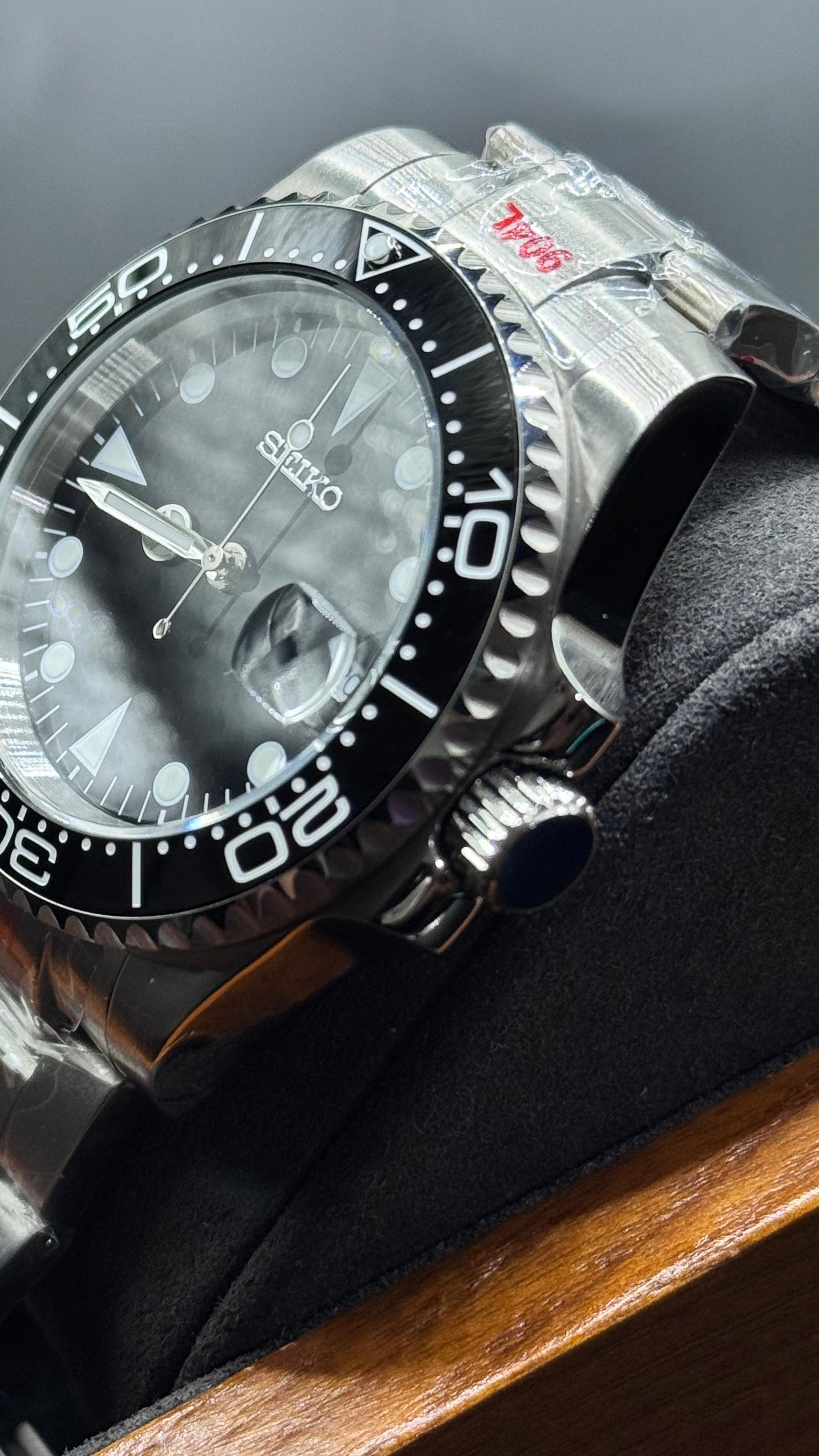 Cristal de zafiro, acero inoxidable solido, resistencia al agua 3ATM, bisel giratorio, movimiento automático cerrado.